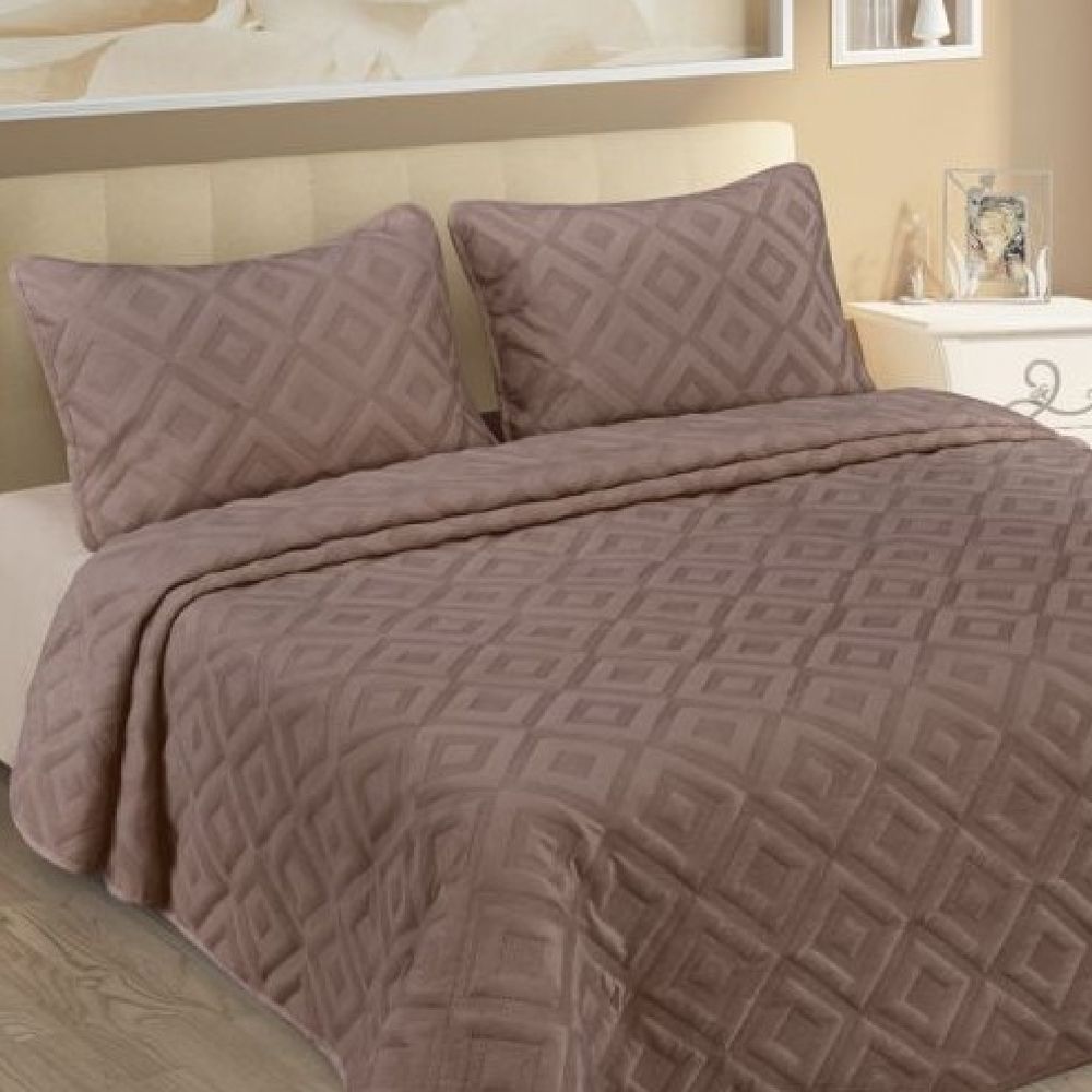 В комплект входит покрывало 250х230 см и две декоративных наволочки 50х70 см с ушками. Классический дизайн - клетка, выполненная стежкой ультрастеп, нежная и приятная ткань (искусственный велюр), а также широкая гамма пастельных цветов сделают приятным и легким Ваш выбор под свой интерьер. Нижняя сторона покрывала и наволочек выполнена из однотонной ткани (полиэфирное волокно) в тон основной ткани. Края покрывала оформлены декоративным подворотом шириной 5 см, ушки наволочек - шириной 5 см.Состав ткани:100% полиэстер. Плотность ткани: 150г/м2.