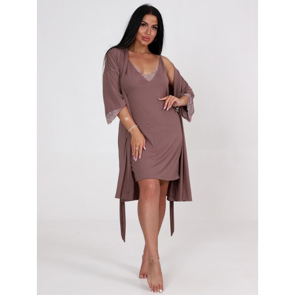 Гарнитур женский из вискозы с запахом сорочка и халат коричневый однотонный