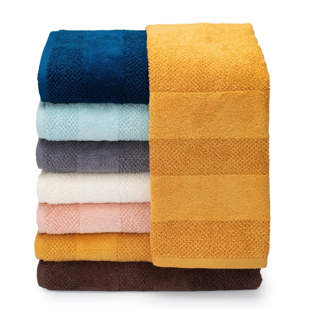 В таких дизайнах всегда есть многослойность структур и узоров. В полотне полотенца рельефный рисунок в виде шашечки и полосы в бордюрной части изделия – это узнаваемые элементы современного стиля. А вот вхождение в коллекцию интересных оттенков, таких как цвет дижонской горчицы, новые цвета коллекции хаки и сине-зелёный цвета - это отсыл к стилю эклектика.