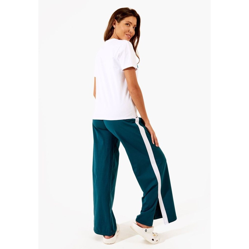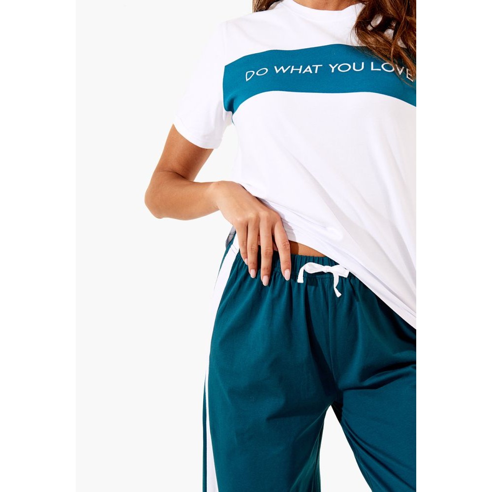 Пижама выполнена из качественного плотного хлопкового материала — приятно телу и глазу. Комфортная посадка, прямой свободный крой — перфекто. Футболка с коротким рукавом и круглым вырезом дополнена действительно качественным принтом. Трендовые брюки клеш с лампасами и разрезами выполнены в невероятном зеленом цвете. Чтобы удержать все это великолепие, брюки дополнены широким поясом с мягкой резинкой и завязками.