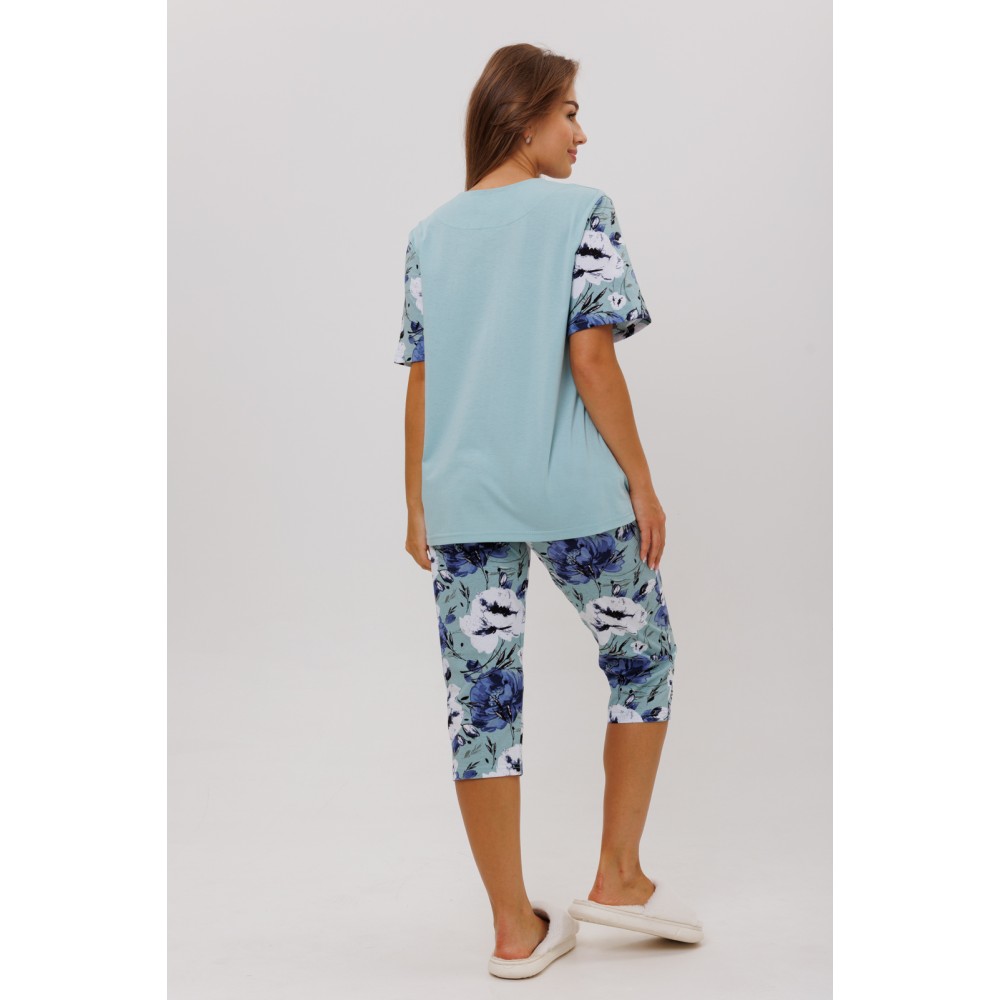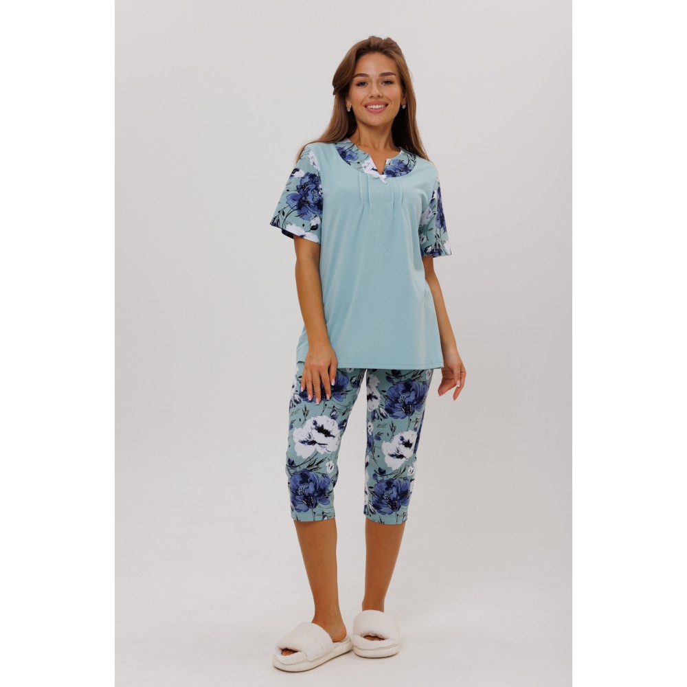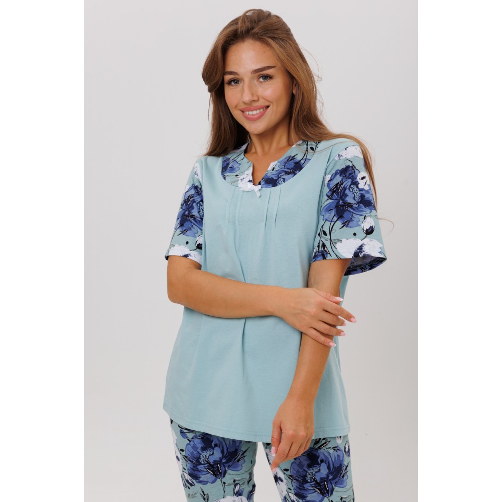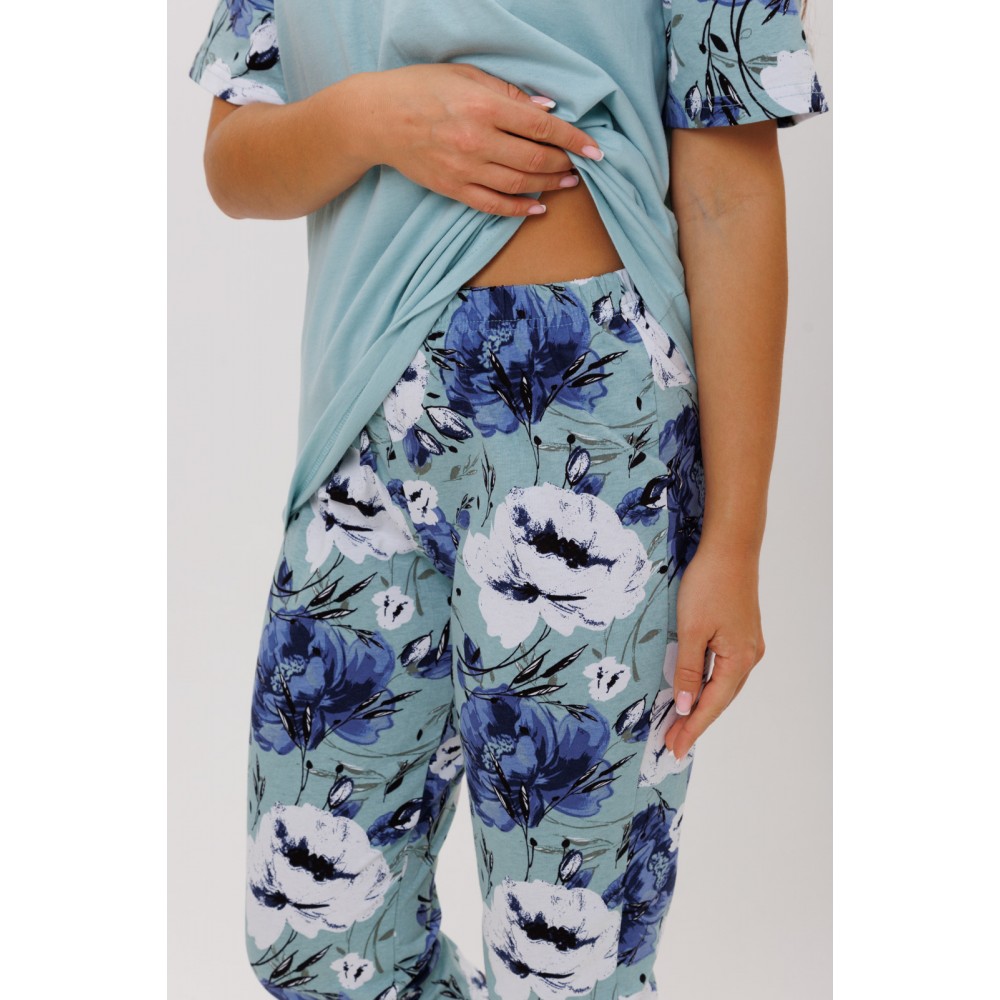 Пижама женская из кулирки футболка с бриджами Голубой, Синий Цветы