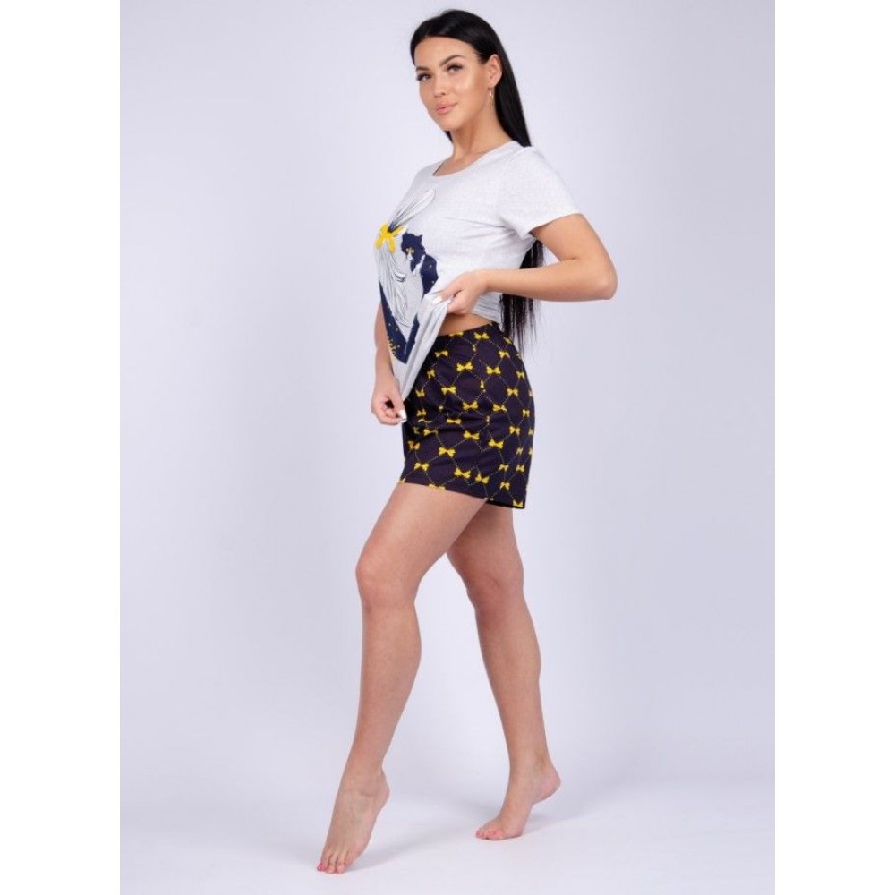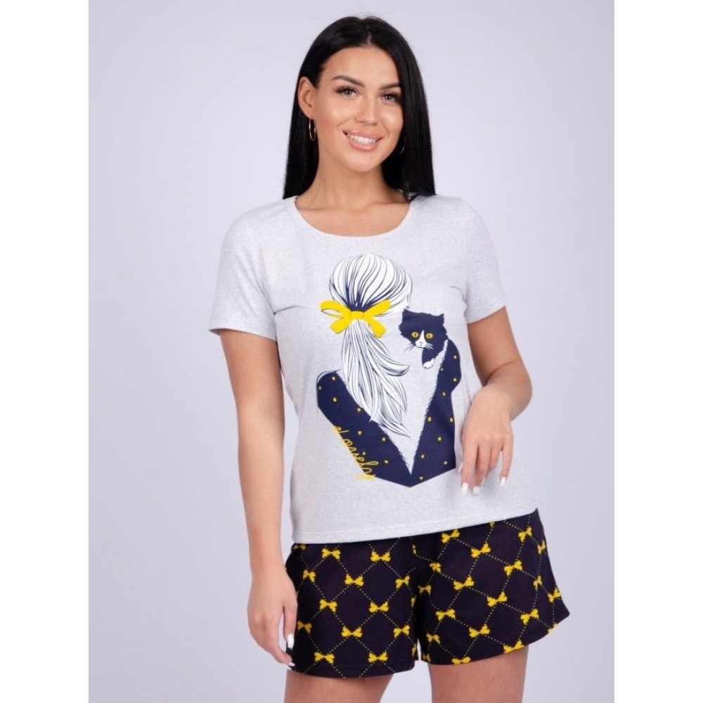 Костюм состоит из футболки и шорт. Футболка с круглой горловиной,  рукав короткий.  Шорты прямого кроя для удобства и комфорта, пояс на резинке.  Костюм мягкий и приятный к телу, не стесняет движения.