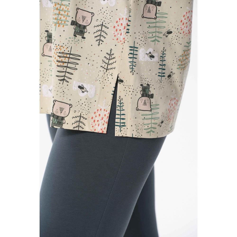 Футболка с принтом свободного силуэта из хлопкового полотна. Круглый вырез горловины обработан рибаной, широкие рукава. По низу изделия в боковых швах разрезы. Состав: 100% хлопок