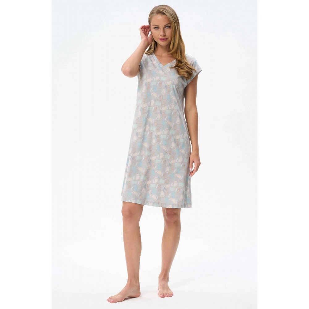 Ночная сорочка А-образного силуэта выполнена из хлопкового полотна. Красивый V-образный вырез горловины. Цельнокроеные короткие рукава с притачными манжетами. Длина изделия чуть ниже колена. Состав: 100% хлопок