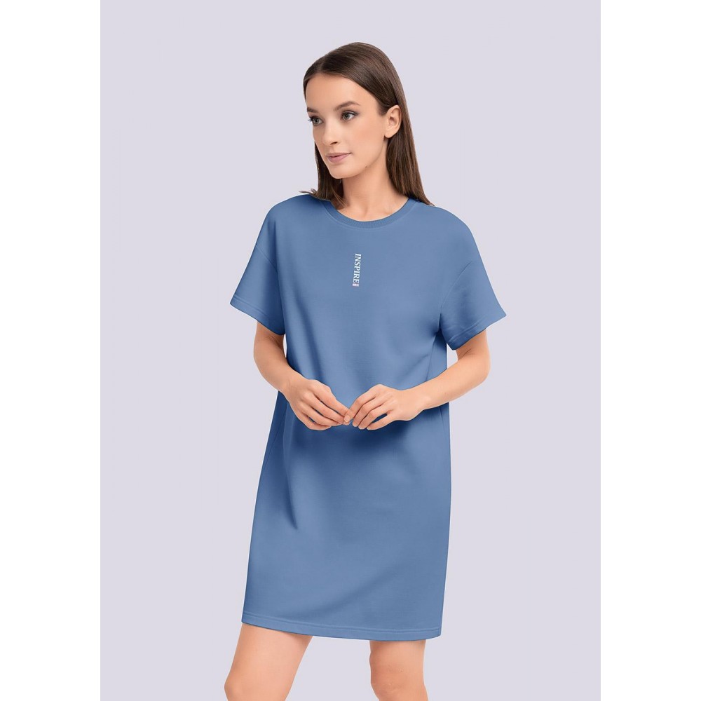 Платье-футболка из футера 3-х нитки. Округлая горловина из кашкорсе. Спущенная линия плеча. Завершает дизайн принт. Состав: 73% хлопок, 27% полиэстер