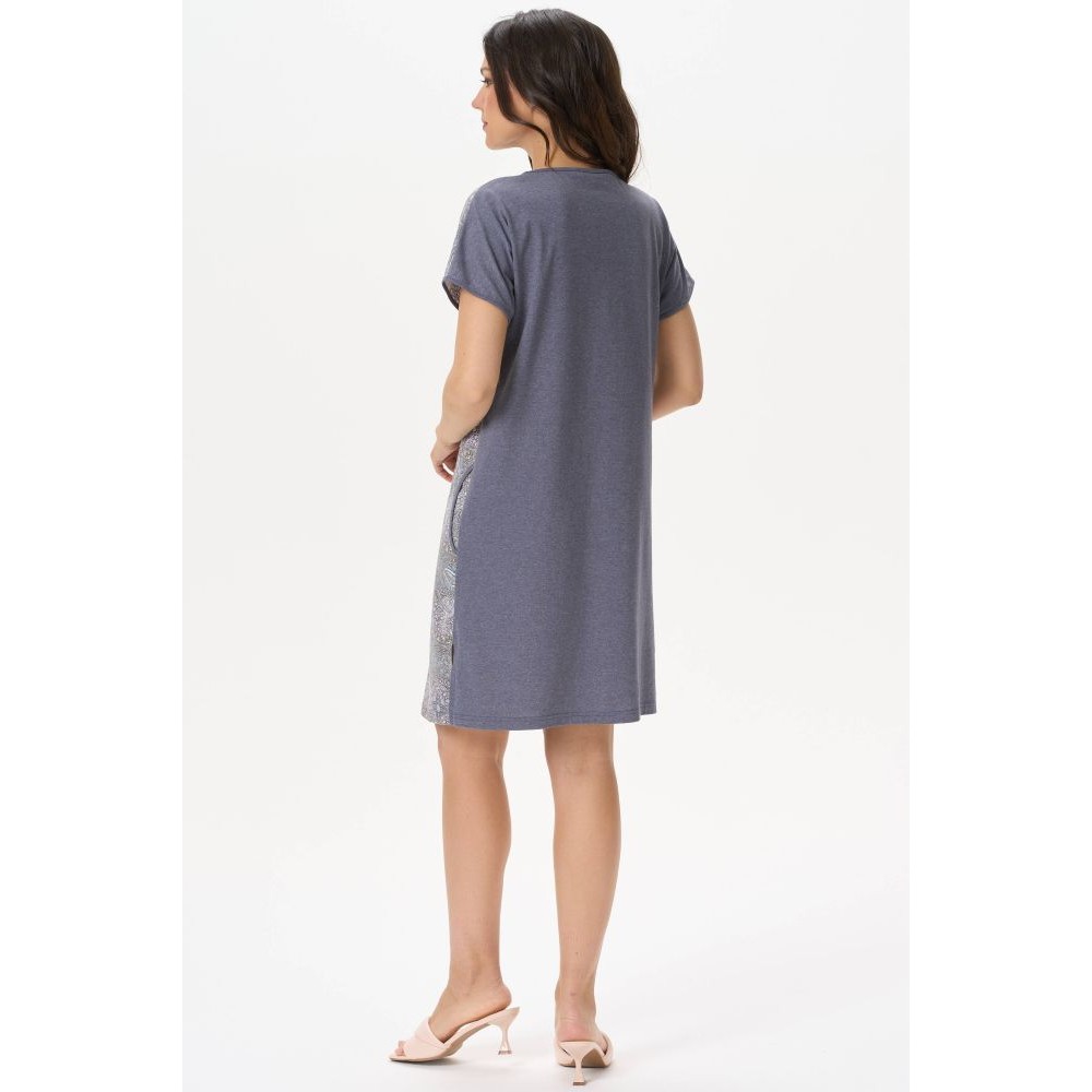 Платье прямого силуэта из сочетания хлопкового и меланжевого трикотажных полотен. Круглый вырез горловины, спущенная линия плеча, цельнокроенные короткие рукава. В боковых швах карманы и по низу разрезы. Длина изделия до колена. Состав: 80% хлопок, 20% полиэстер