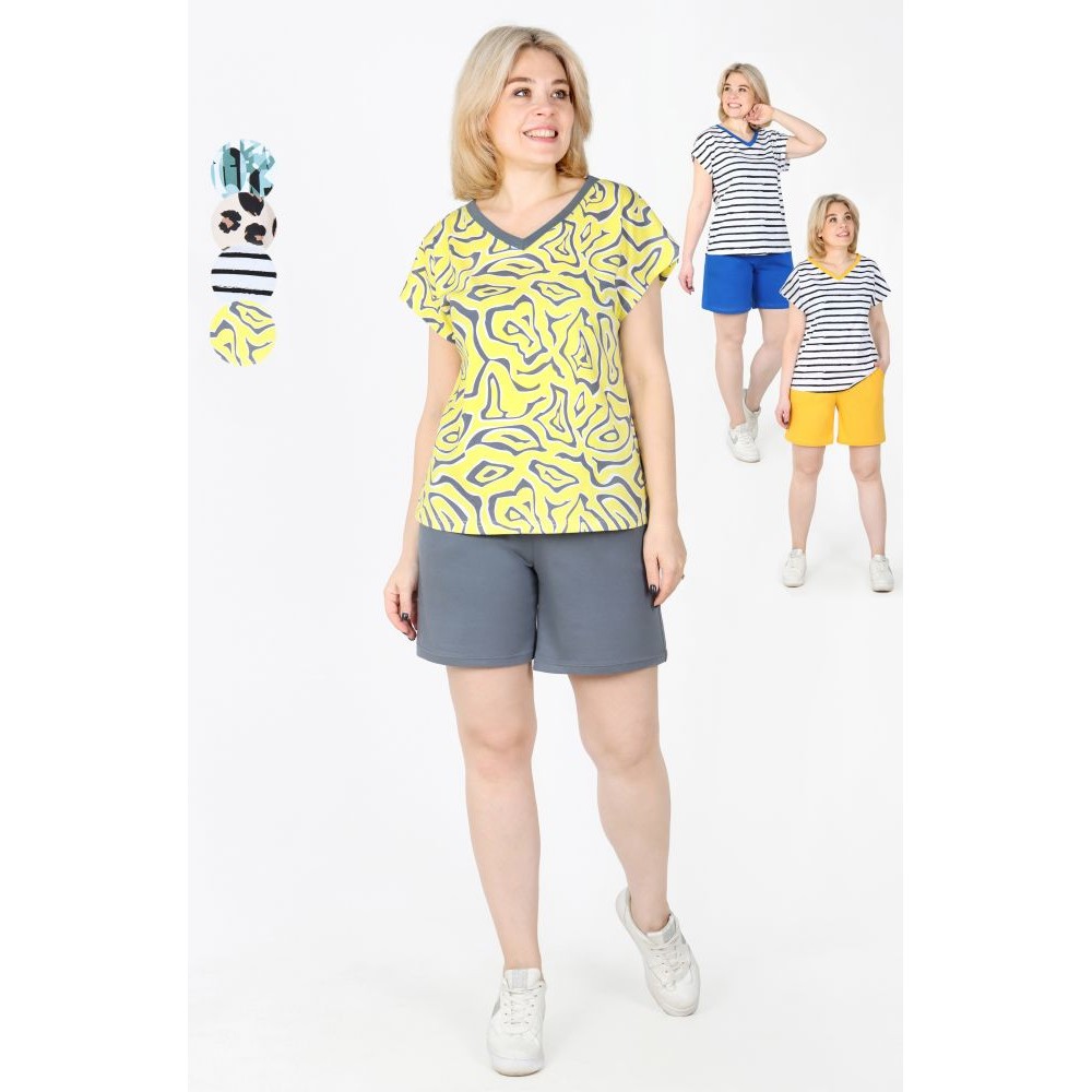 Трикотажный костюм с актуальным V-образным вырезом, подчеркнутым отделочной тканью. Удобные шорты с карманами отлично садятся на любую женскую фигуру, удлиненная футболка скрывает недостатки и зрительно удлиняет силуэт. Костюм выпускается из популярных набивных рисунков ткани. Состав: хлопок 100%