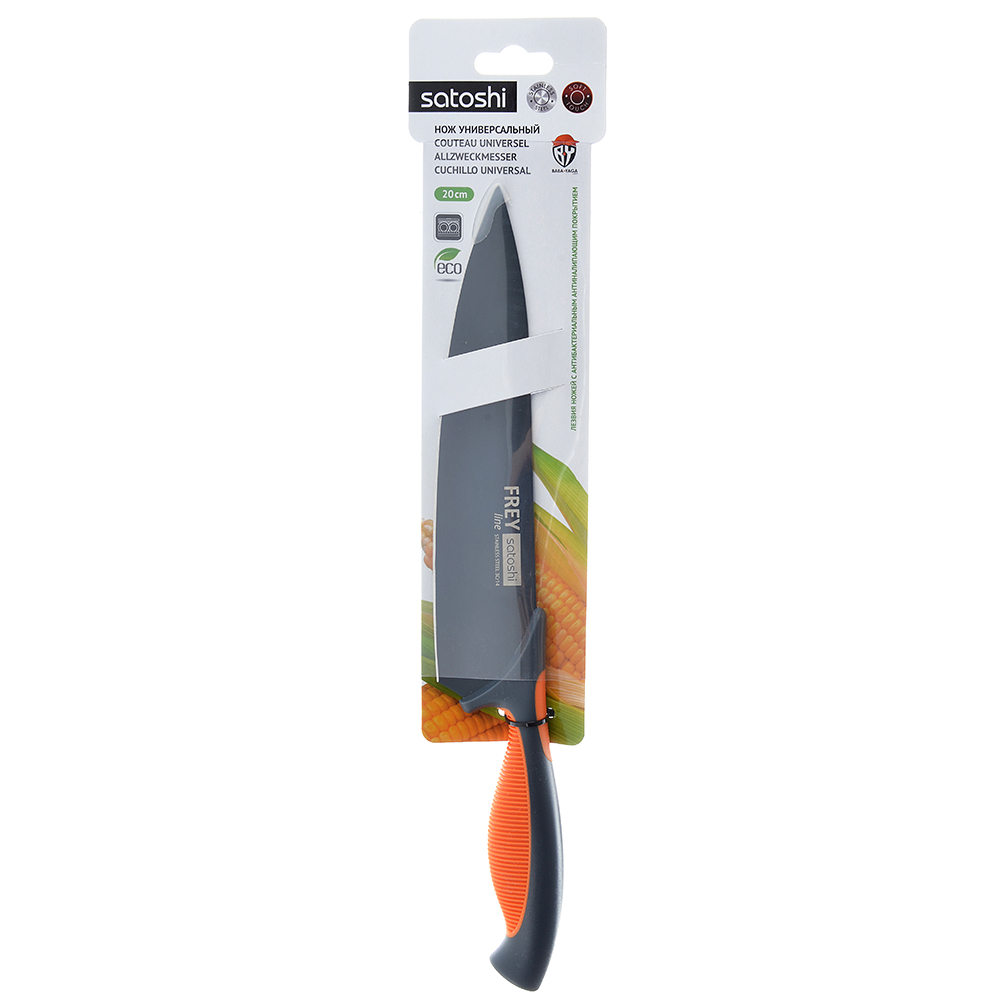 Кухонный шеф-нож SATOSHI «Фрей» с длиной клинка 20 см с антиналипающим покрытием – лучший помощник для домашнего повара. Имеет удобную форму лезвия, которое позволяет быстро и эффективно производить шинковку продуктов в шефской технике. Нескользящая рукоять с покрытием «soft-touch» комфортно ложится в руку, поэтому кисть и запястье не устают даже при длительной нарезке. Нож не подвержен коррозии, легко моется, долго держит заточку.