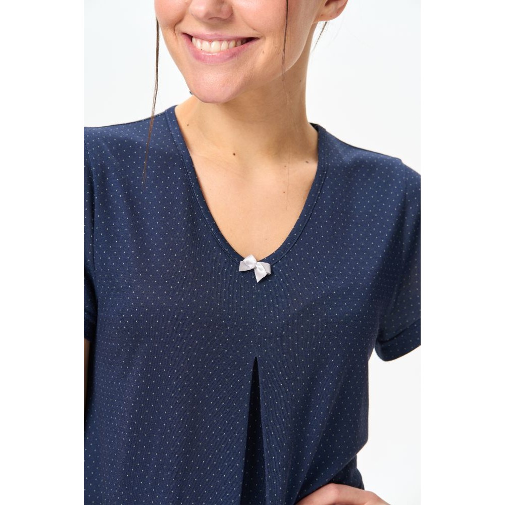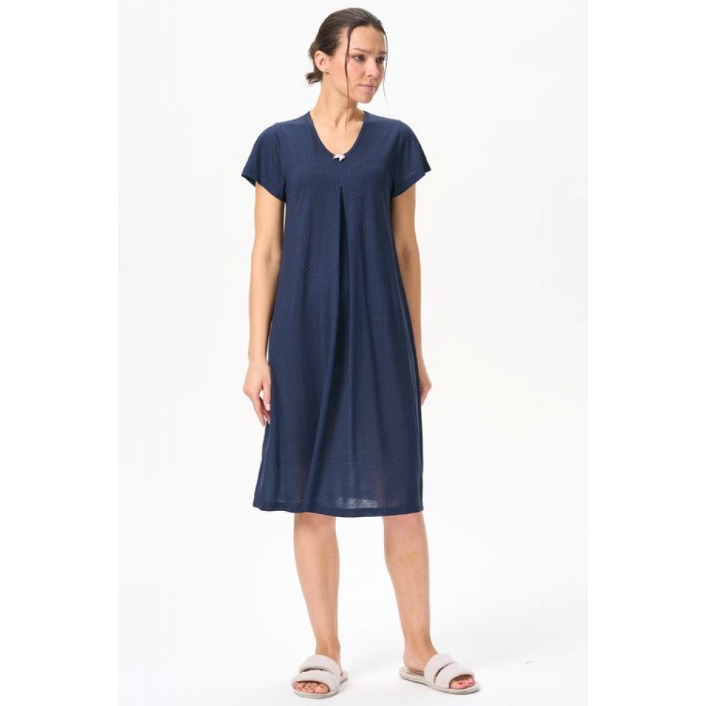 Сорочка А-образного силуэта из вискозного полотна. V-вырез горловины украшен бантиком, короткие рукова. Длина изделия ниже колена.