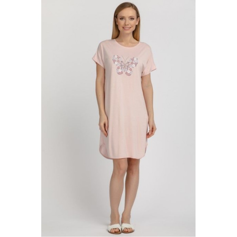 Ночная сорочка А-силуэта с коротким рукавом из вязанного эластичного хлопкового полотна качества пенье. U-вырез горловины, длина изделия до колена.