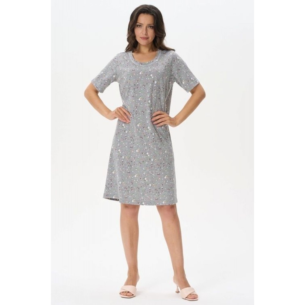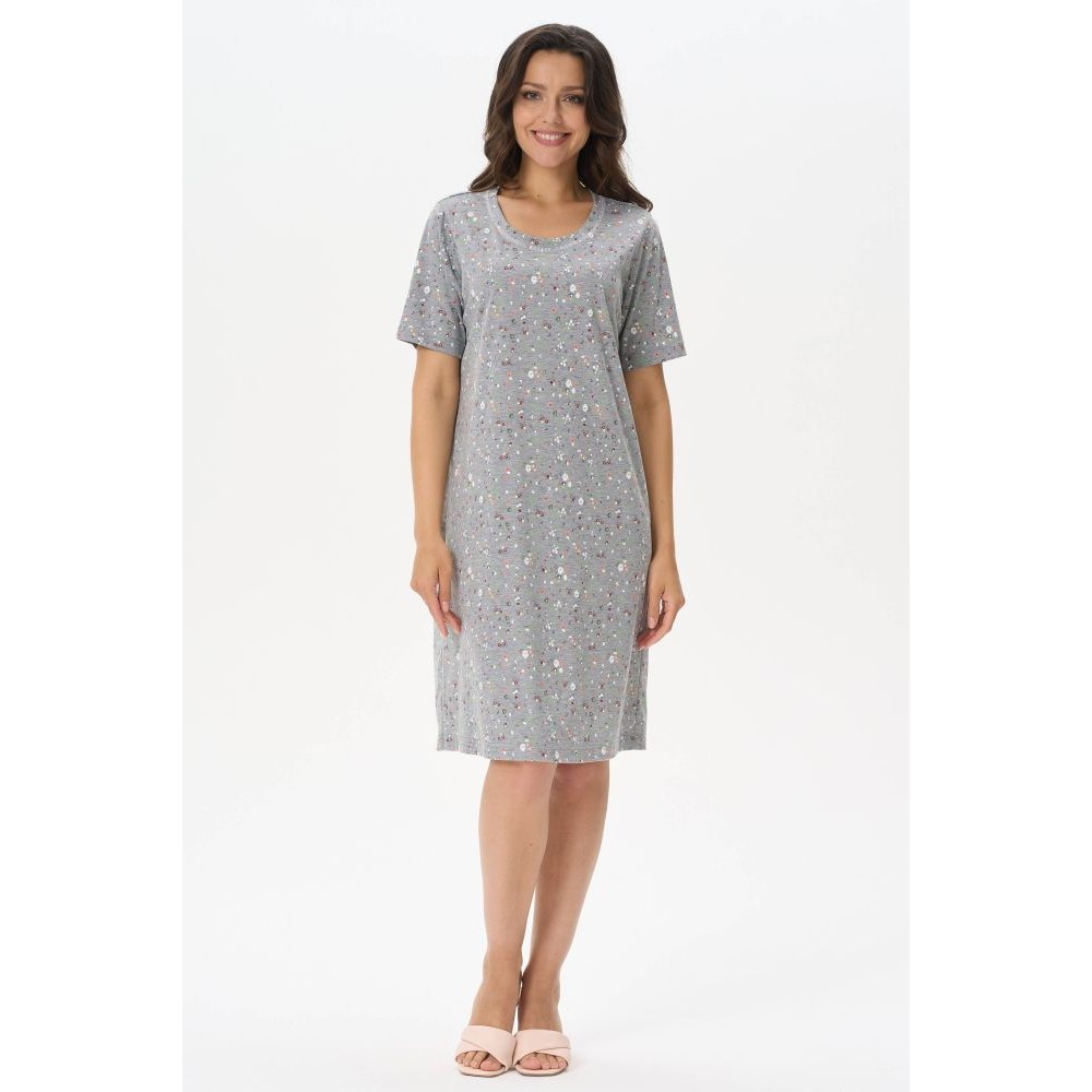 Ночная сорочка прямого силуэта из хлопкового меланжевого трикотажного полотна. Круглый вырез горловины, втачные короткие рукава. Длина изделия до колена. Состав: 70% хлопок, 30% полиэстер